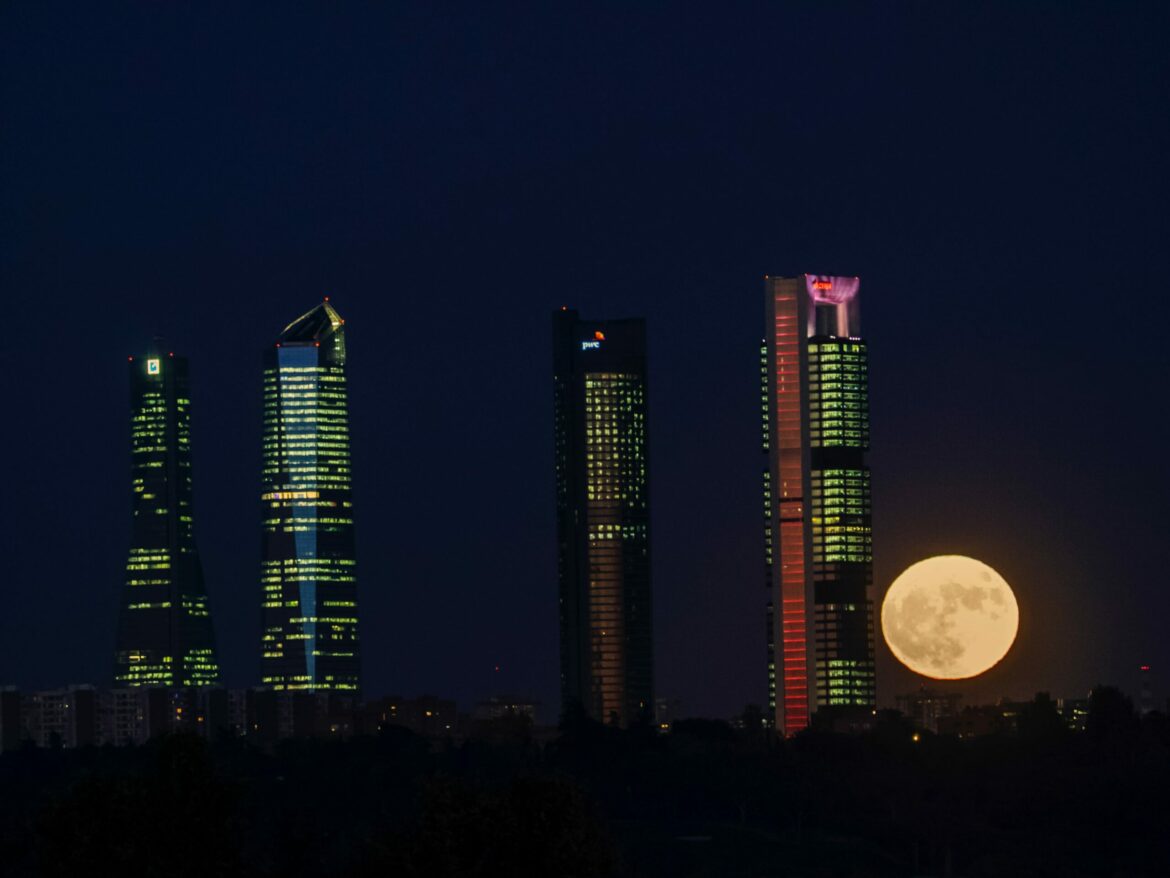 Madrid’s skyline, with its distinctive skyscrapers like the Cuatro Torres Business Area, provides a modern foreground to the ancient and unchanging moon. The combination of the orange full moon and the skyline can create a sense of wonder and serve as a reminder of the constant interplay between humanity and the greater universe.